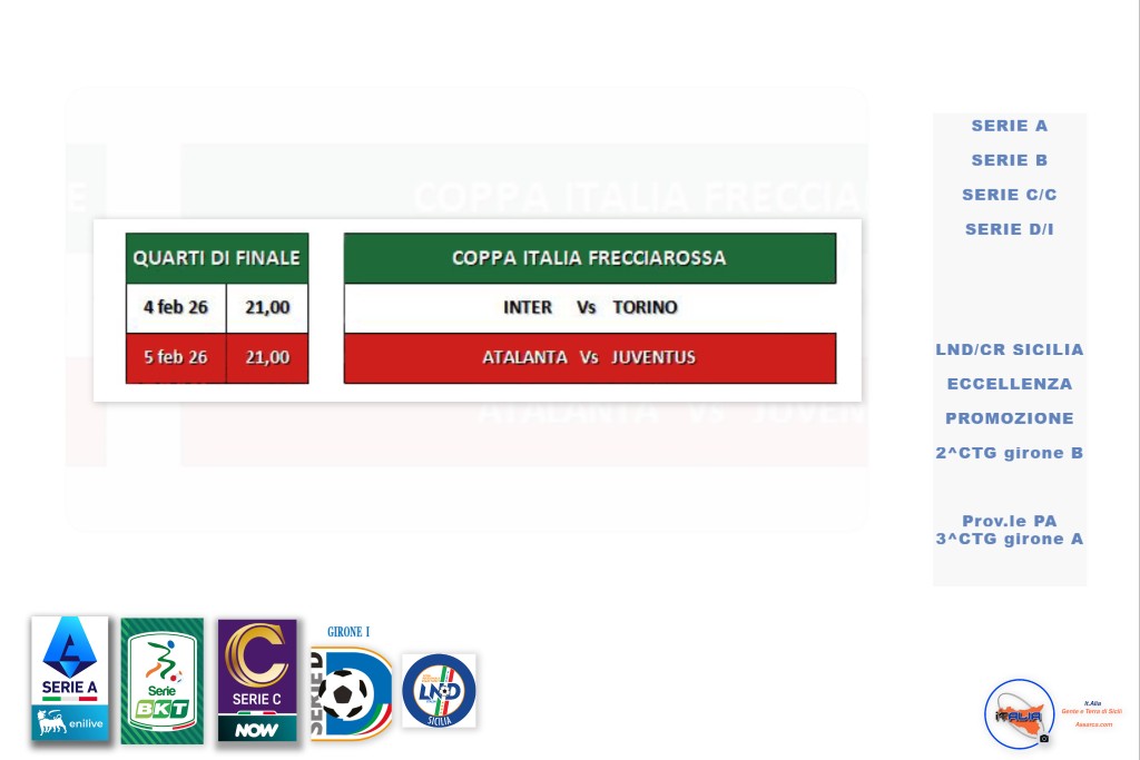 SERIE A/B - SERIE C/C - SERIE D/I LND/CR SICILIA : ECCELLENZA PROMOZIONE 2^CATEGORIA - 3^CATEGORIA A/ Prov.le PA maggiori dettagli su: https://www.tuttocampo.it/Homepage https://www.aia-figc.it/