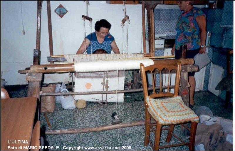 La Sig.ra Di Salvo Grazia, in Via Roxiura qualche anno fa, mentre lavora al suo vecchio telaio per produrre un tappeto.